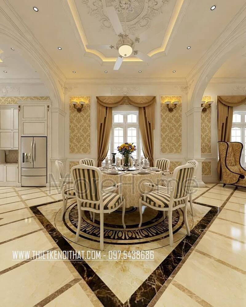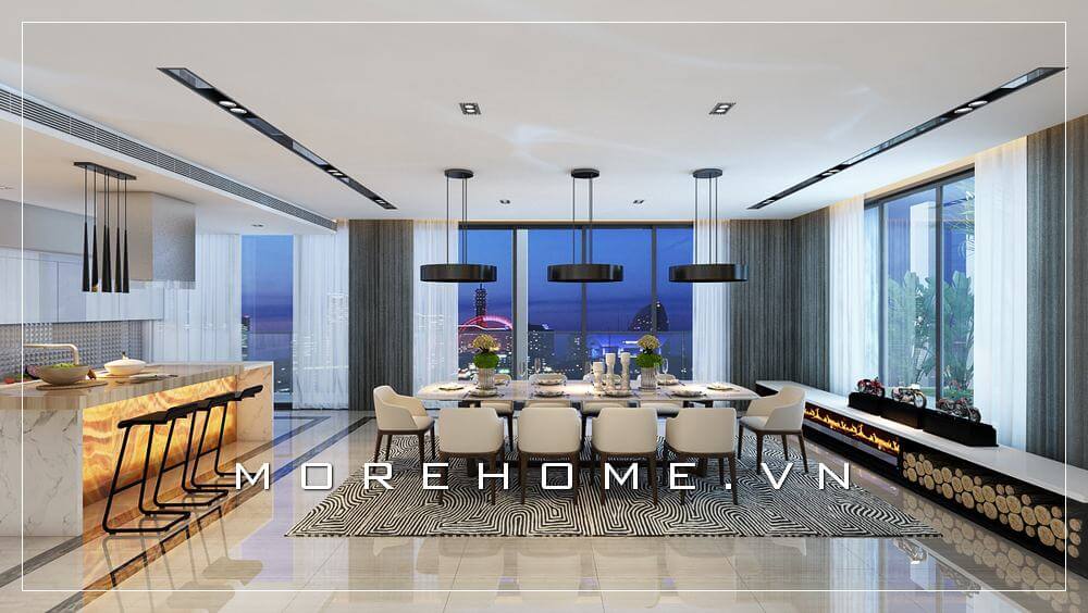Bàn ăn thiết kế vừa phải gia chủ tránh được cảm giác xa cách trống trải mà vẫn rất gần gũi vơi nhau, bàn tiệc lúc nào cũng tràn ngập sự ấm cúng